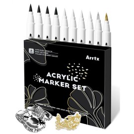 High-quality ARRTX waterproof acrylic paint marker pens set is designed for painting on different surfaces, such as as paper, cardboard, canvas, fabrics of various compositions, metal, ceramics, plastic, wood, stone and others. The set includes 10 felt-tip pens: 4 white colour, 4 black colour and 1 shiny gold and 1 shiny silver color. The markers a..