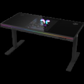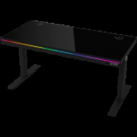 Dual-motor sit/stand adjustable-height gaming desk with wireless charger, RGB lighting, control panel, and USB ports, solid tempered glass tabletop, black.